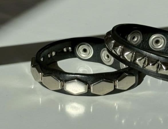 新宿南口にあるアローズ内にてかなり前に購入した物です。写真の白いカード一枚に対し購入品のデータを追加していく形なのでカードはお付けできませんが、証明のため撮影しました。出品商品はブレス本体と最後の写真の革袋です。ゴムは傷んでいたので、出品に当たりAMAZONで購入した新品に交換しています。(ゴム太さ0.6mm)今後先々のため予備で少し何本かおまけで付けておきます。商品の状態や真贋については、これまでの経験と判断に基づき、出品しております。\r恐れ入りますが、こちらの商品は安心鑑定に対応しておりません。\r\r理由として、以前のお取引の際に、こちらとしては間違いなく正規品として保証できる品物を、規準に満たないものとして扱われてしまった経緯があるためです。\r\rクロムハーツは非常にデリケートな特性上、使用頻度やポリッシュによる摩耗などで外見、形状がやや変化している場合がございます。\rそのため正規品も規準外として見なされてしまうリスクがあります。\r\rしかしクロムハーツにご理解がある方であれば、こちらの記載の画像にて許容範囲かどうかご判断できるかと思っております。\r\r大変お手数ですが、上記の内容にてご検討いただけましたら幸いです。| カテゴリー: | ファッション>>>アクセサリー>>>ブレスレット |
